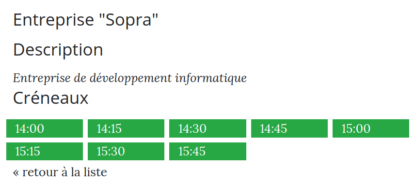 On souhaite pouvoir associer des crénaux à chaque entreprise. Un créneau est une heure à laquelle il est possible de rencontrer l'entreprise pendant le forum des stages (pour la prise de rendez-vous).