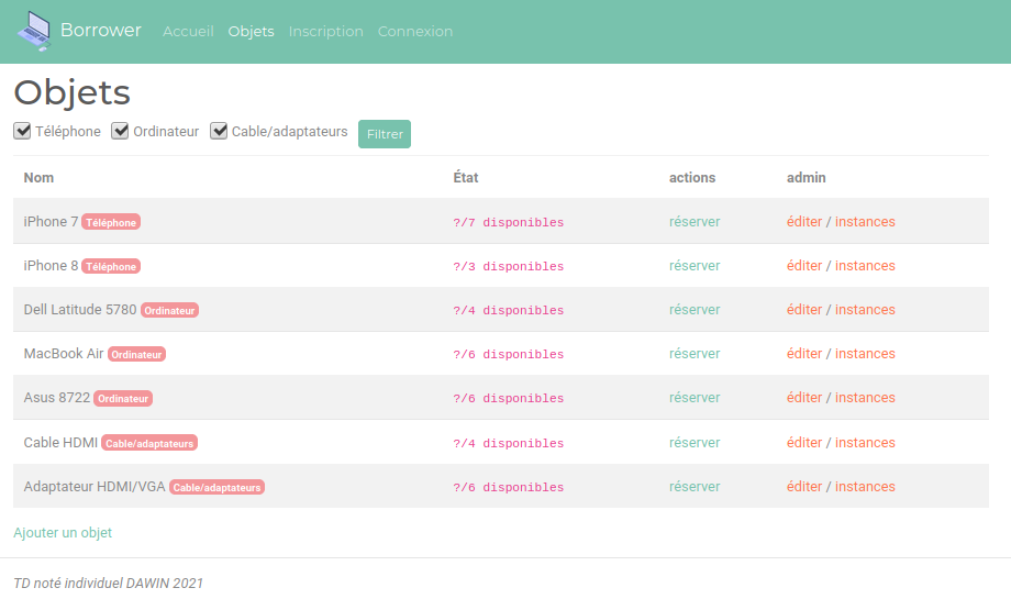 La page "objets" est dotée d'un formulaire permettant de filtrer les objets par catégories, qui n'est pour l'instant pas fonctionnel (le formulaire est créé et affiché mais pas exploité).